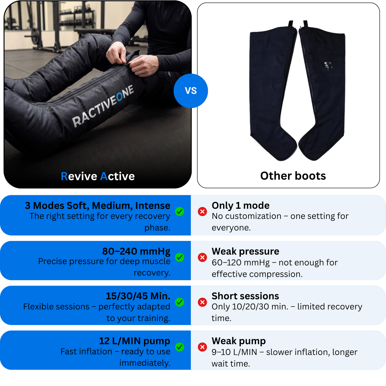 Revive Active delivers more power, control, and precision than standard recovery boots. With a higher pressure range, multiple modes, and smart features like memory and remote control, it’s built for real results, not basic recovery.